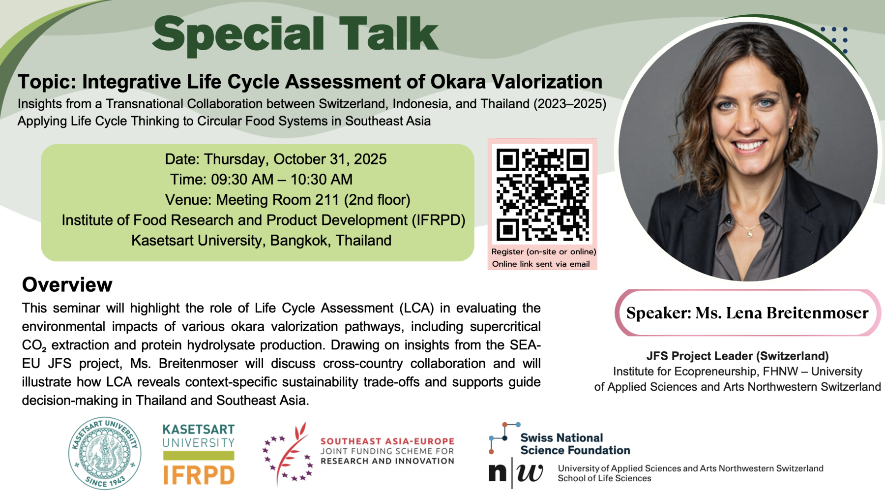 ขอเชิญเข้าร่วมฟังบรรยายพิเศษเเรื่อง “Integrative Life Cycle Assessment of Okara Valorization: Insights from a Transnational Collaboration between Switzerland, Indonesia, and Thailand (2023–2025)” โดย Ms. Lena Breitenmoser จาก Institute for Ecopreneurship, School of Life Sciences, University of Applied Sciences and Arts Northwestern Switzerland (FHNW) ประเทศสวิตเซอร์แลนด์