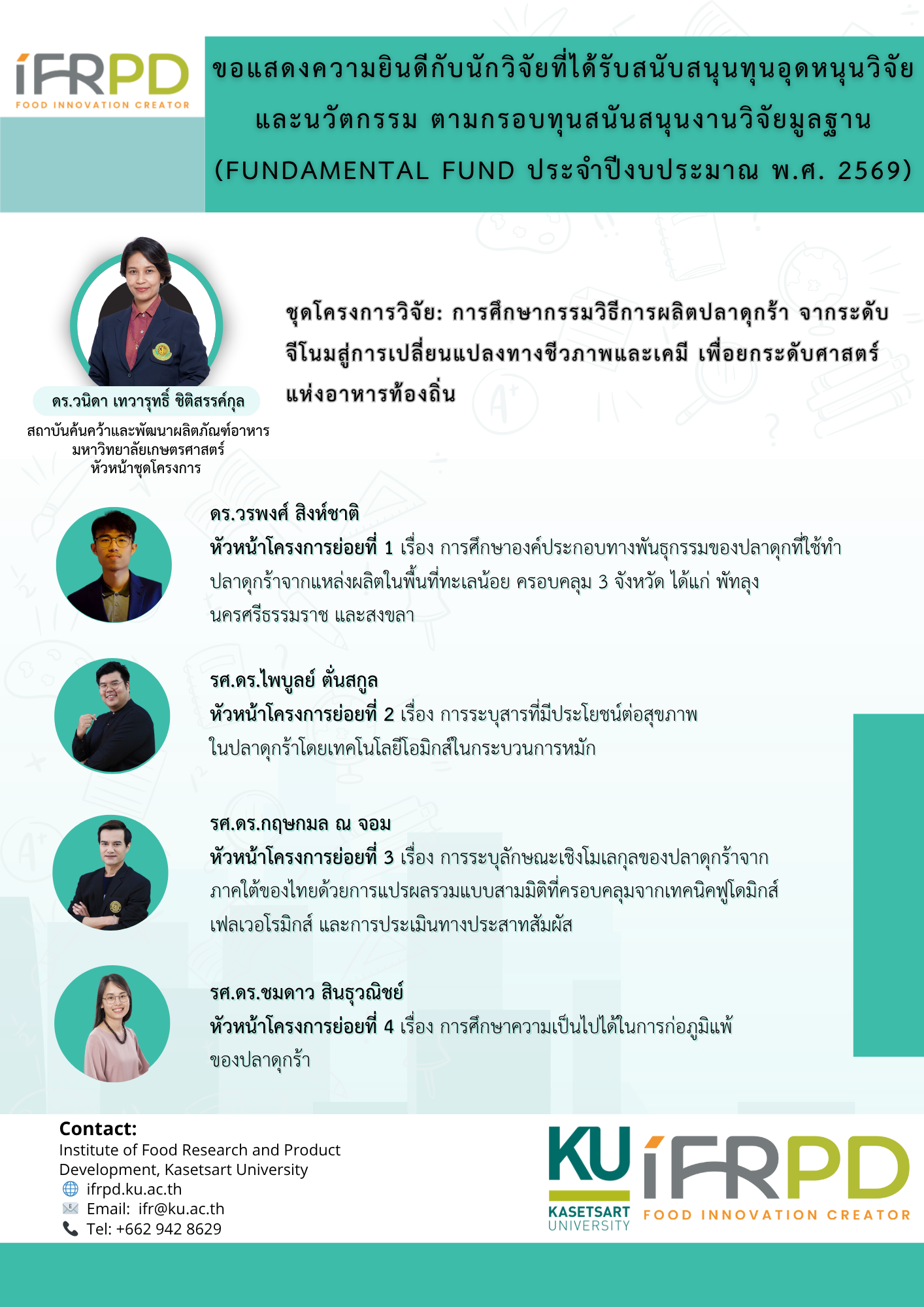 ขอแสดงความยินดีกับนักวิจัยจากสถาบันค้นคว้าและพัฒนาผลิตภัณฑ์อาหาร มหาวิทยาลัยเกษตรศาสตร์ ที่ได้รับทุนสนับสนุนงานวิจัยและนวัตกรรม (Fundamental Fund ประจำปีงบประมาณ พ.ศ. 2569)