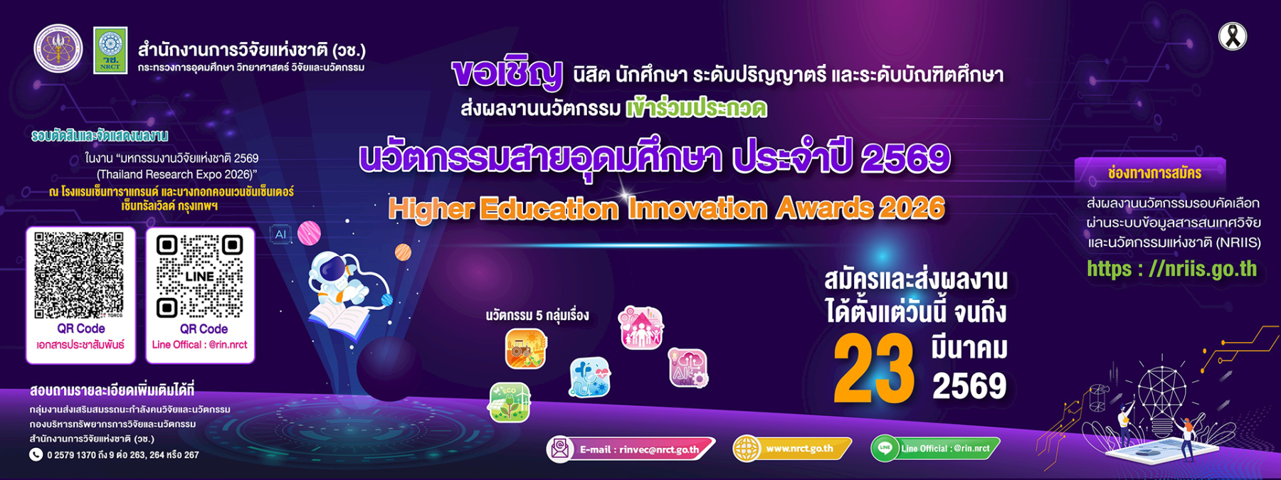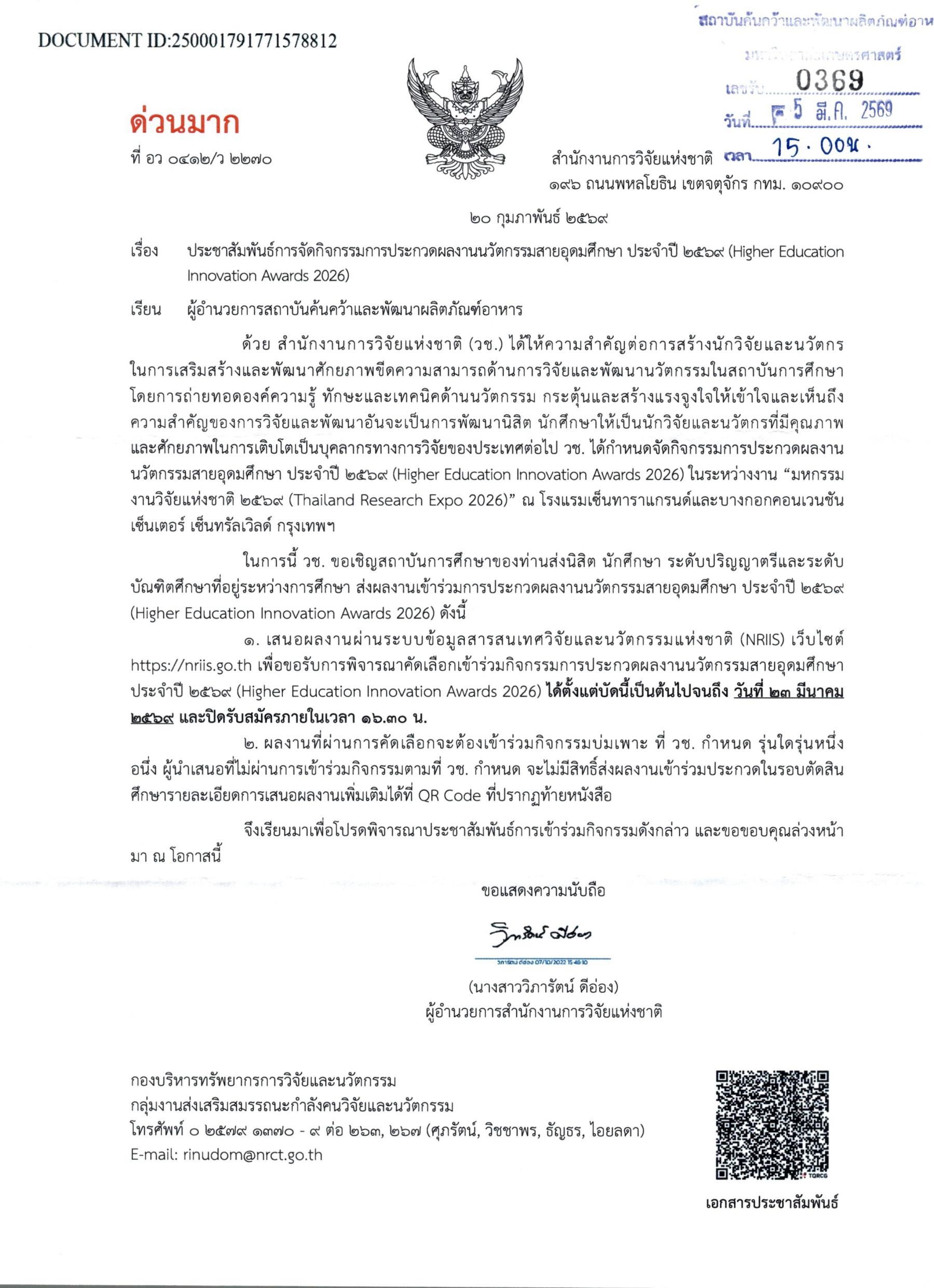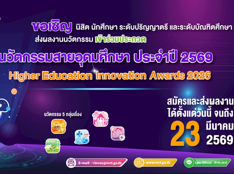 1. เสนอผลงานผ่านระบบข้อมูลสารสนเทศวิจัยและนวัตกรรมแห่งชาติ (NRIIS) เว็บไซต์ https://nriis.go.th เพื่อขอรับการพิจารณาคัดเลือกเข้าร่วมกิจกรรมการประกวดผลงานนวัตกรรมสายอุดมศึกษา ประจำปี ๒๕๖๙ (Higher Education Innovation Awards 2026) ได้ตั้งแต่บัดนี้เป็นต้นไปจนถึง วันที่ ๒๓ มีนาคม ๒๕๖๙ และปิดรับสมัครภายในเวลา ๑๖.๓๐ น.