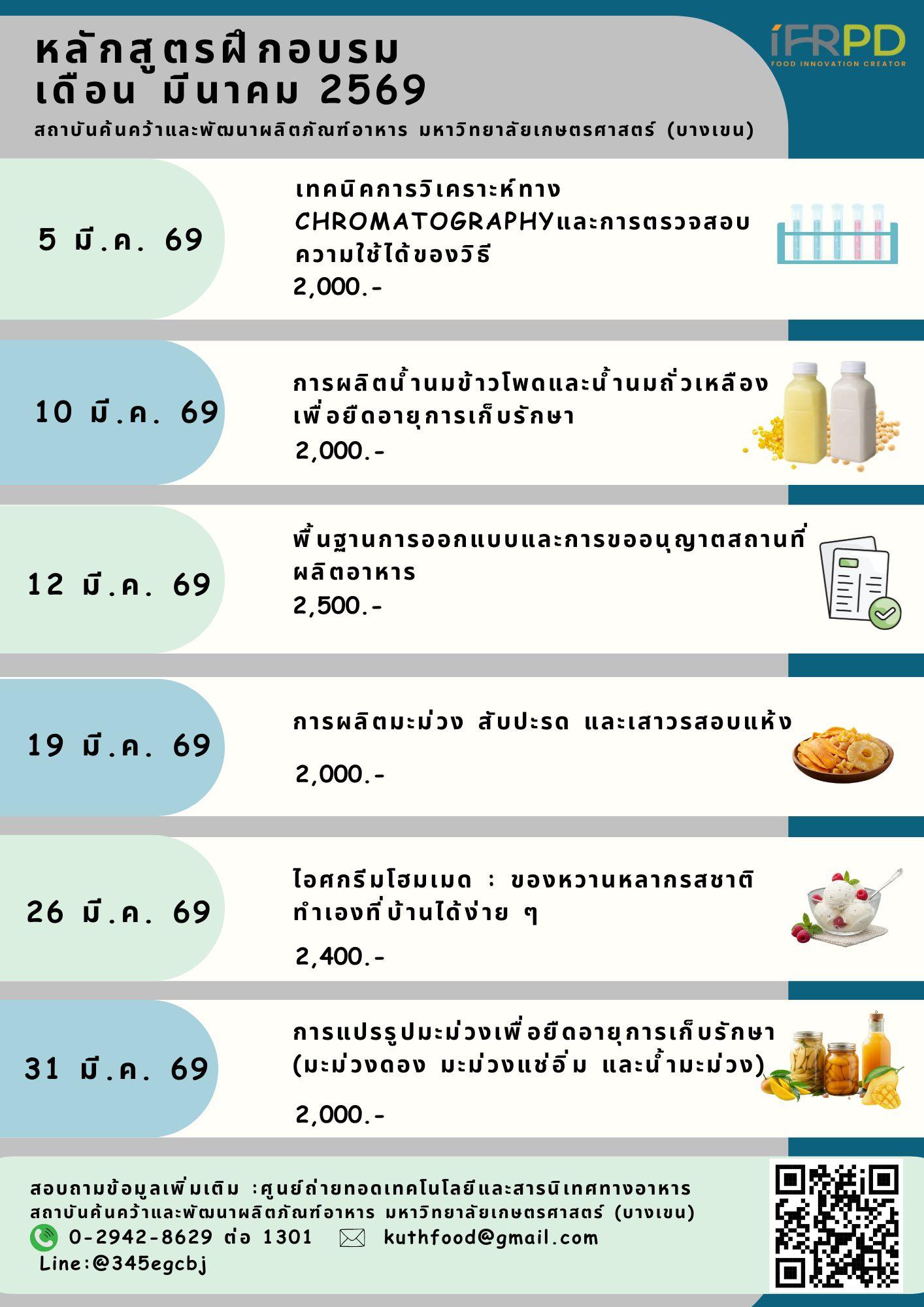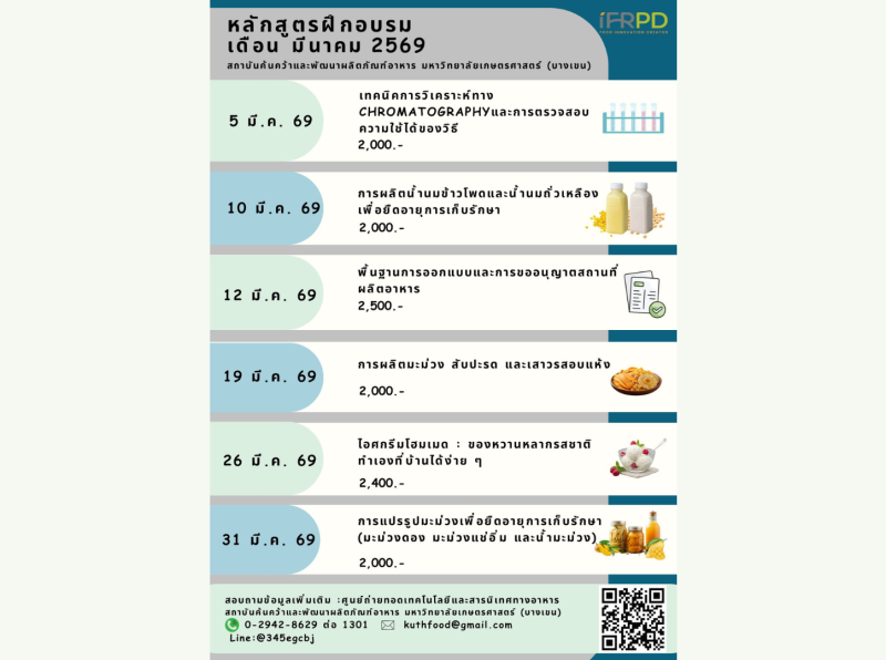 ประชาสัมพันธ์ตารางหลักสูตรฝึกอบรม เดือนมีนาคม 2569 สถาบันค้นคว้าและพัฒนาผลิตภัณฑ์อาหาร