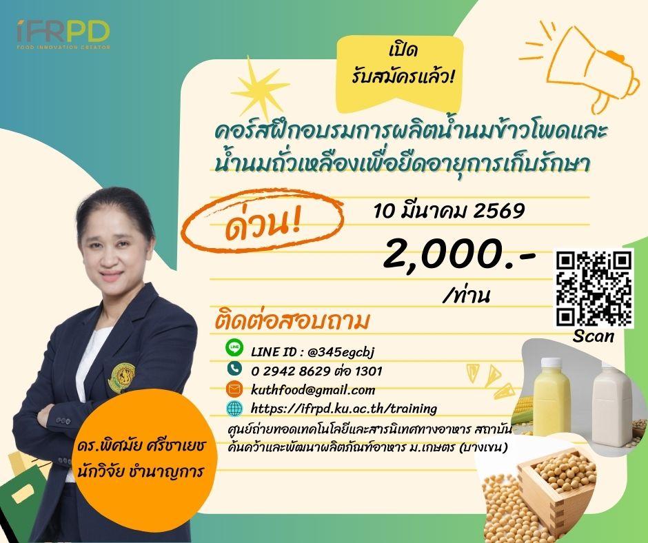 ประชาสัมพันธ์ฝึกอบรมหลักสูตร การผลิตน้ำนมข้าวโพดและน้ำนมถั่วเหลืองเพื่อยืดอายุการเก็บรักษา