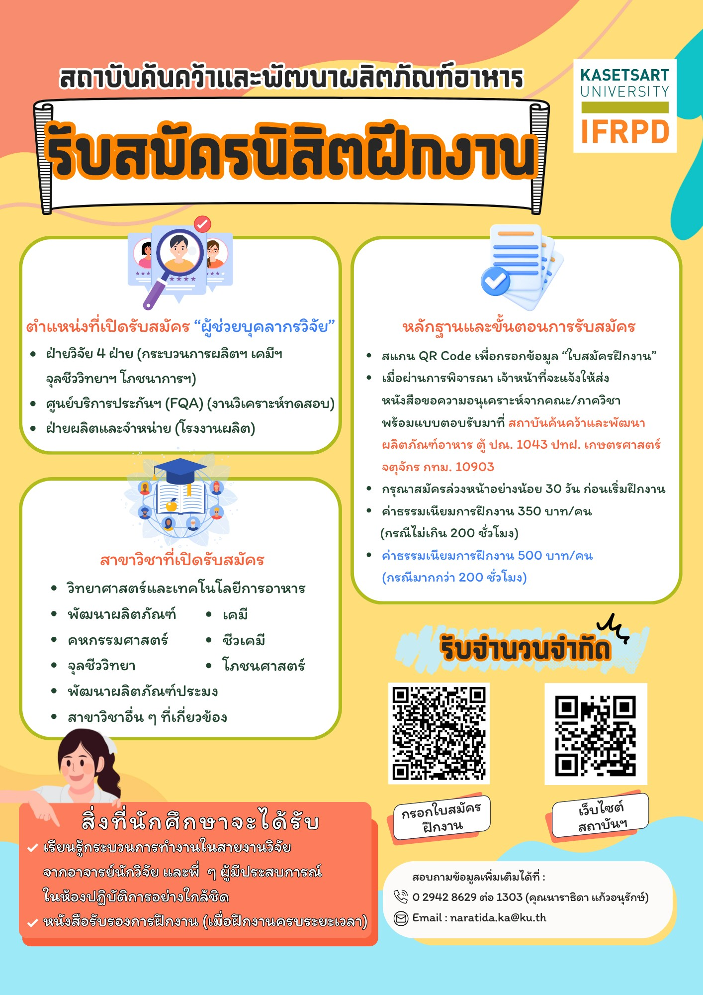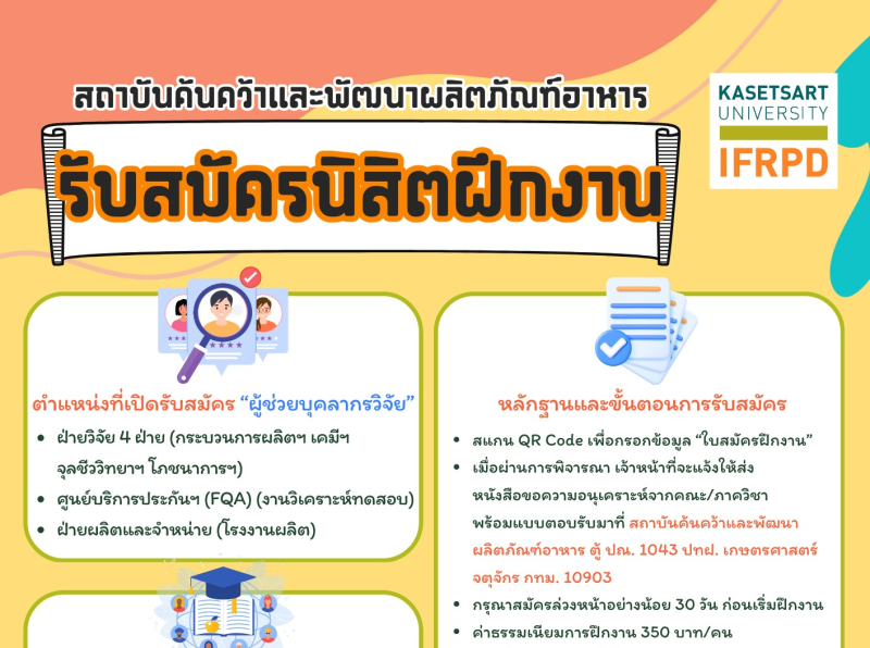 สถาบันค้นคว้าและพัฒนาผลิตภัณฑ์อาหาร IFRPD เปิดรับสมัครนิสิต/ นักศึกษาฝึกงาน