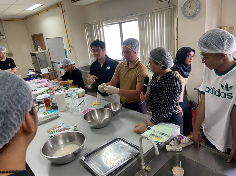 เมื่อวันที่ 19 พฤศจิกายน 2568 สถาบันค้นคว้าและพัฒนาผลิตภัณฑ์อาหาร ร่วมกับวิทยาลัยนานาชาติ มหาวิทยาลัยเกษตรศาสตร์ จัดกิจกรรม ฝึกอบรมเชิงปฏิบัติการเรื่อง “สาธิตและปฏิบัติการการประกอบอาหารไทย (อาหารคาวและอาหารหวาน)” เพื่อเพิ่มพูนความรู้ทางวิชาการและประสบการณ์ทางวัฒนธรรม ให้กับนิสิตชาวไทยและชาวต่างชาติ จำนวน 40 คน โดยมีนักวิจัยสถาบันฯ เป็นวิทยากรบรรยายให้ความรู้ดังนี้
