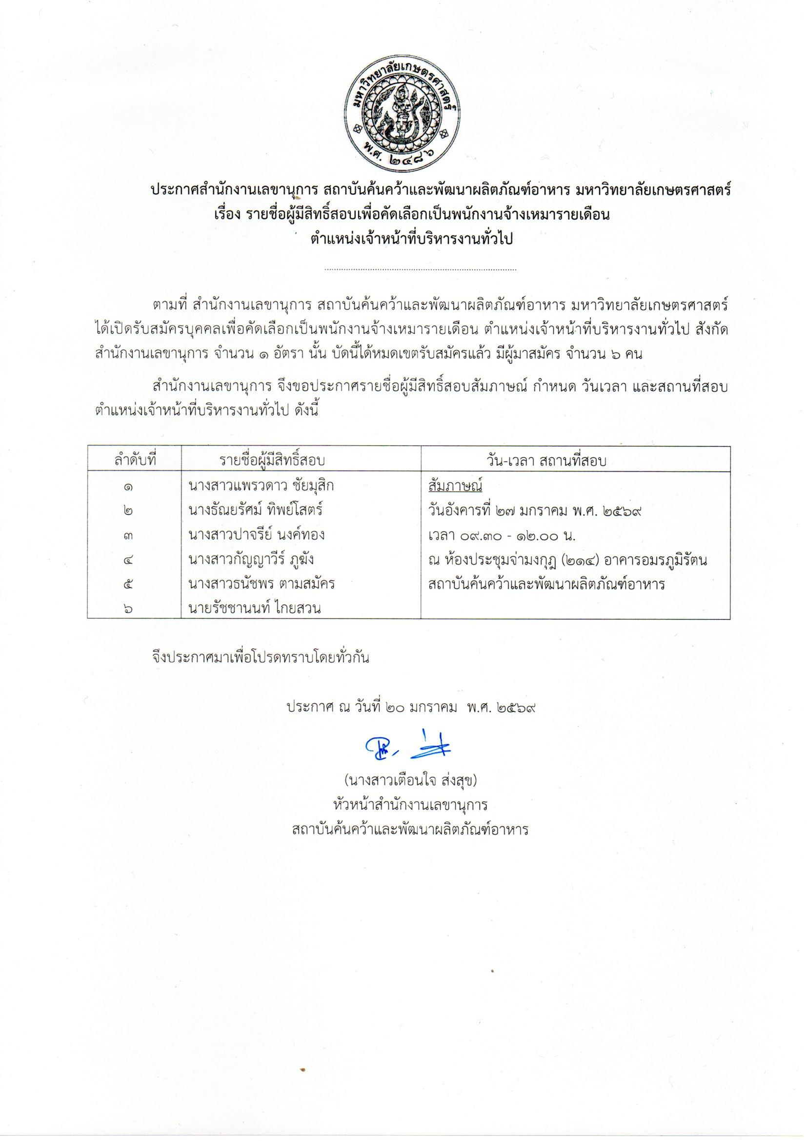 ประกาศสำนักงานเลขานุการ สถาบันค้นคว้าและพัฒนาผลิตภัณฑ์อาหาร มหาวิทยาลัยเกษตรศาสตร์