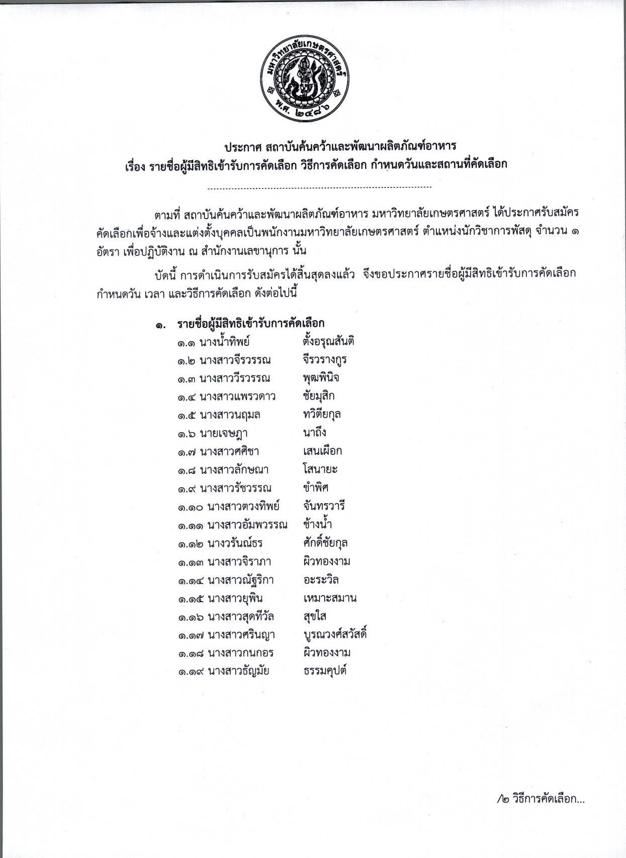 เรื่อง รายชื่อผู้มีสิทธิเข้ารับการคัดเลือก วิธีการคัดเลือก กำหนดวันเวลาและสถานที่คัดเลือก