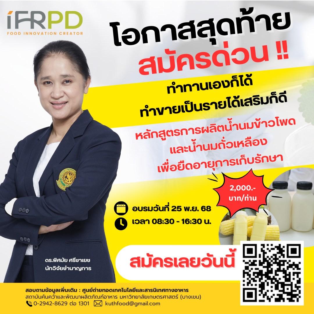 ประชาสัมพันธ์หลักสูตรฝึกอบรม "หลักสูตรการผลิตน้ำนมข้าวโพดและน้ำนมถั่วเหลือง เพื่อยืดอายุการเก็บรักษา"