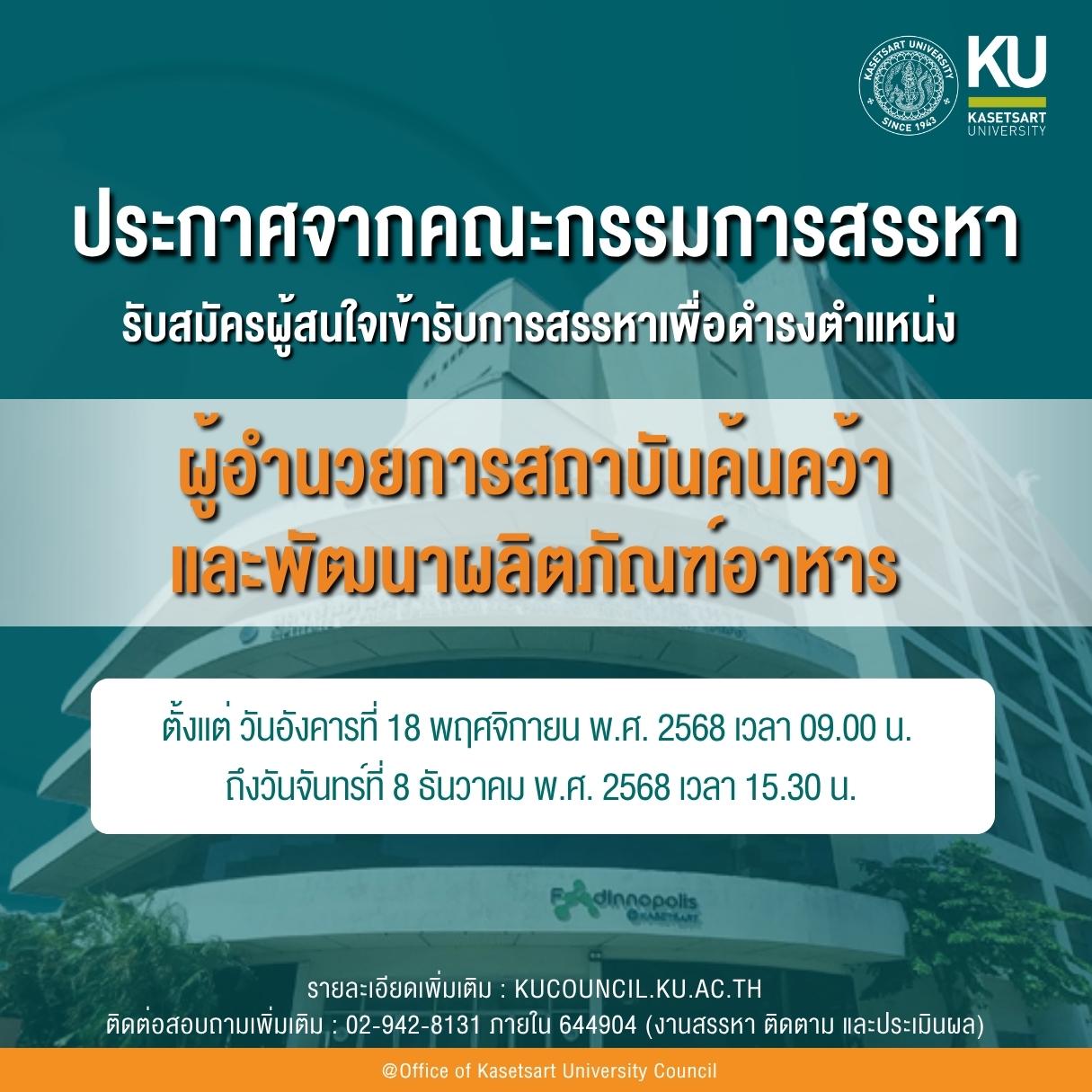 รับสมัครผู้สนใจเข้ารับการสรรหา เพื่อดำรงตำแหน่งผู้อำนวยการสถาบันค้นคว้าและพัฒนาผลิตภัณฑ์อาหาร