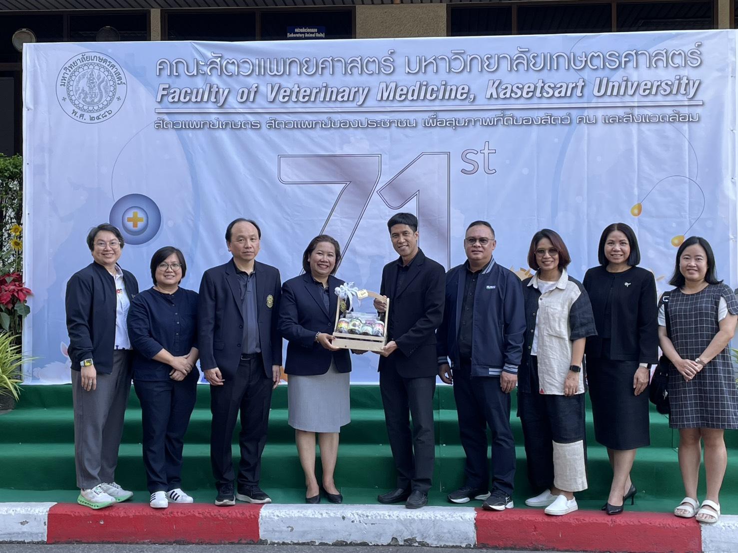 วันศุกร์ที่ 26 ธันวาคม 2568 ดร.นิพัฒน์ ลิ้มสงวน รองผู้อำนวยการสถาบันค้นคว้าและพัฒนาผลิตภัณฑ์อาหาร พร้อมด้วยคณะผู้บริหาร และบุคลากรสถาบันฯ ร่วมแสดงความยินดีเนื่องในโอกาสวันคล้ายวันสถาปนาคณะสัตวแพทยศาสตร์ มหาวิทยาลัยเกษตรศาสตร์ ครบรอบ 71 ปี โดยมี ผศ.สพ.ญ.ดร.วราพร พิมพ์ประไพ คณบดีคณะสัตวแพทยศาสตร์ พร้อมด้วยคณะผู้บริหาร และบุคลากร ให้การต้อนรับ ณ คณะสัตวแพทยศาสตร์ มหาวิทยาลัยเกษตรศาสตร์ บางเขน