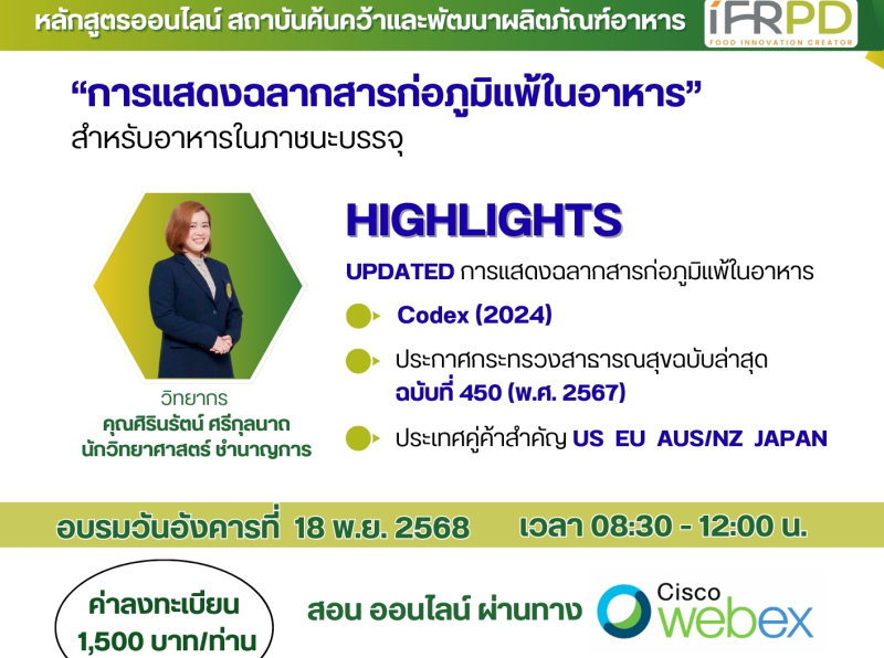 ประชาสัมพันธ์หลักสูตรฝึกอบรม (ออนไลน์) "การแสดงฉลากสารก่อภูมิแพ้ในอาหาร สำหรับอาหารในภาชนะบรรจุ"